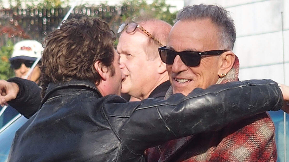 Dressed in a flannel shirt, jeans and sunglasses, Springsteen met up with White, dressed as Bruce in a leather jacket, jeans and boots, in Bayonne, New Jersey on a car dealership set. The two shared a hug, and caught up with director Scott Cooper as the trio appeared to be having a happy conversation.